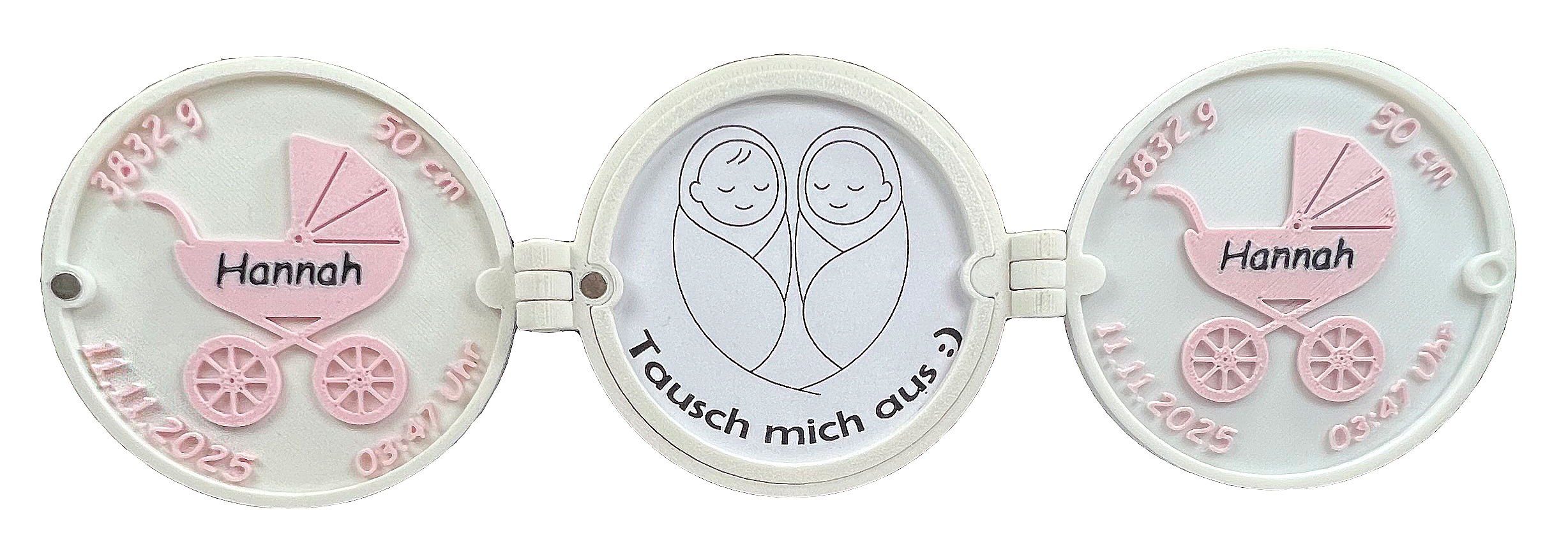 - Mitte: Platz für Babyfoto (mit herausnehmbarem Ring zum Einklemmen)